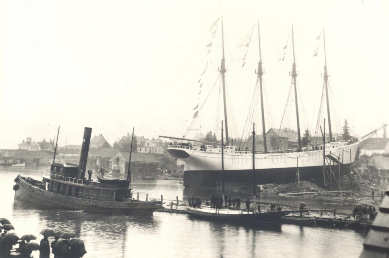 At 1000 tons, Captain Benjamin Pinkham’s boat, the Eleanor F. Bartram was the largest built by the W.I. Adams yard of East Boothbay. After her 1903 launch, she carried cargo such as coal and southern yellow pine. There are records of the Bartram being stranded and re-floated at least twice in her 23 year career. She is seen in this photograph just prior to her launching from the shipyard.